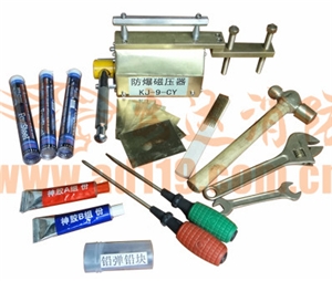 无火花防爆电磁式堵漏工具用于各种罐体和管道表面点状、线状泄漏的堵漏作业。适用压力≥1.8Mpa,温度使用范围≤80℃,耐介质性能:各种水、油、气、酸、碱、弱酸、盐等 。采用铍铝铜无火花材料。标准配置如下:1个防爆磁压器、1个防爆拱桥、1把防爆去锈粗刷、1把防爆奶锤、1把防爆活扳手、1把防爆双呆扳手、1把防爆一字螺丝刀、1把防爆十字螺丝刀、5块防爆薄衬片、3条快速堵漏胶、10个铅弹铅块、快速AB堵漏胶、铝合金器材箱。